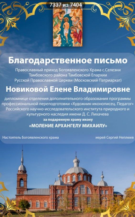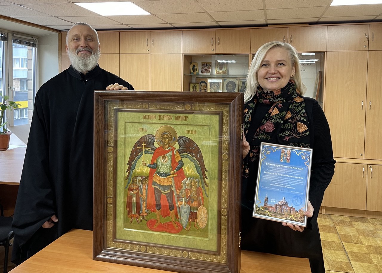 Подаренная нам икона "Моление архангелу Михаилу" – уникальная. Идея и сюжет иконы проработаны автором впервые, и нигде не встречаются. Икона является дипломным проектом художника-иконописца Новиковой Елены Владимировны, дипломницы отделения дополнительного образования Российского научно-исследовательского института природного и культурного наследия им. Д. С. Лихачёва.